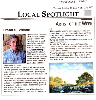 March/April 2007 Paradise Art Center Newsletter Review written by Aldean Keefer of a live painting demonstration and lecture given by Frank Wilson on February 18th 2007 at the Paradise Art Center